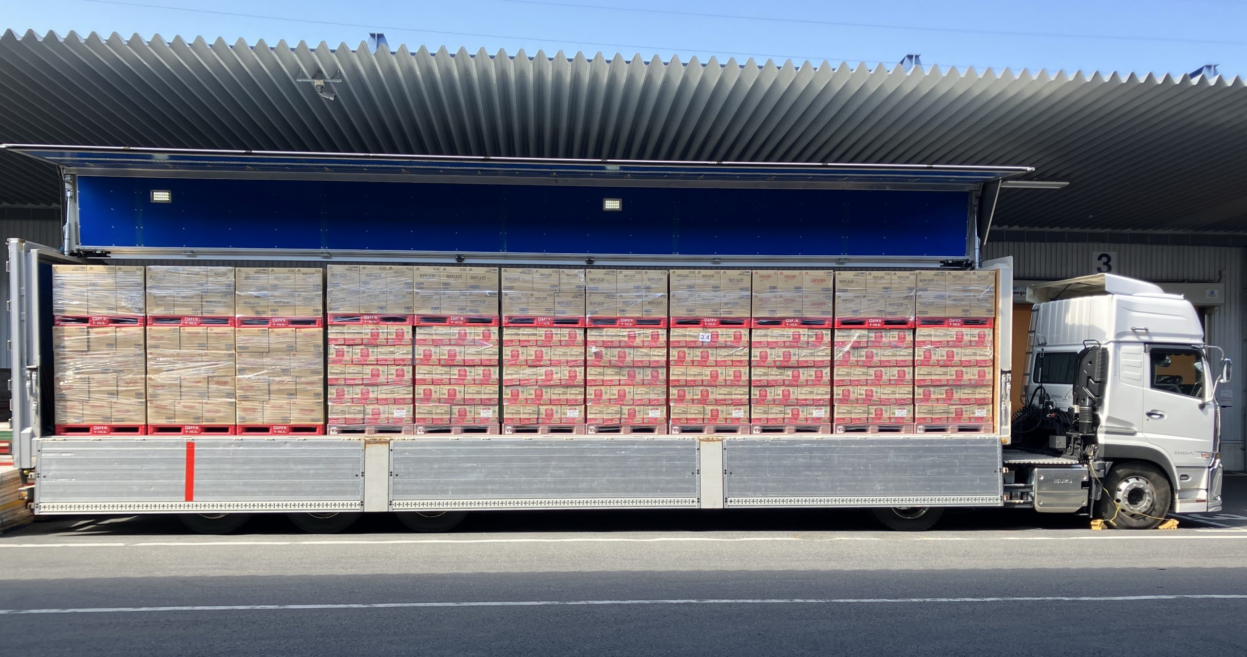 また、輸送時の環境負荷低減には、他企業との協業も重要と考えています。取組事例として、当社は伊藤園および両社の物流パートナーである日本通運と連携し、群馬~北海道間で菓子(軽量物)と飲料(重量物)の重軽混載による共同輸送を行っています。重量の制約から2段積みができない伊藤園の飲料の上部空きスペースに、軽量貨物である当社の菓子を積載することで、荷台の容積を有効活用するとともに、ドライバーの負担軽減を考慮した物流プロセスへと最適化しています。