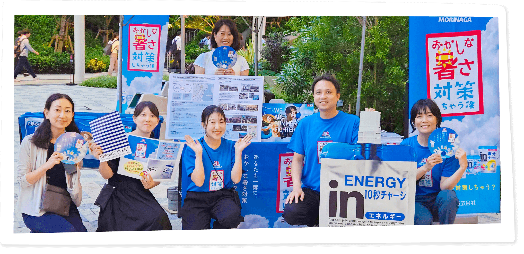 当日は「おかしな暑さ対策しちゃう課」に加え、森永製菓の社会貢献を担当するチームや本社のボランティアも参加し、暑さ対策の大切さをお伝えしました。