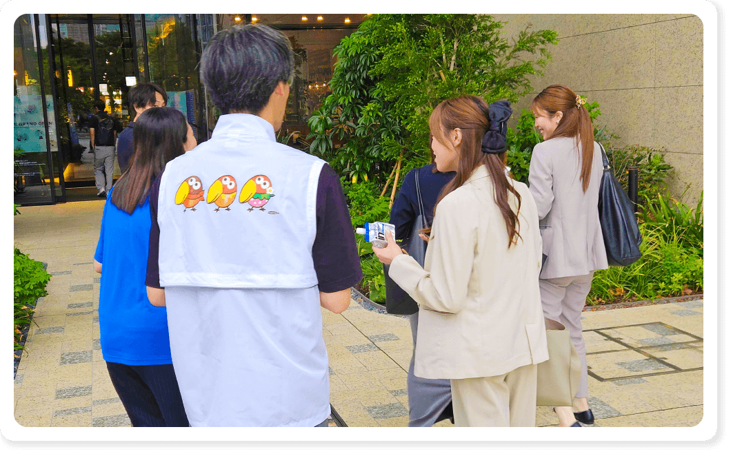 「inゼリー」をお渡しした際には「inゼリー、今朝も飲みました。ありがとうございます。」や「森永の本社って芝浦なんですね。どの辺にあるんですか?」といった声をいただき、商品への親しみとあわせて当社について知っていただける、大変貴重な機会になりました。