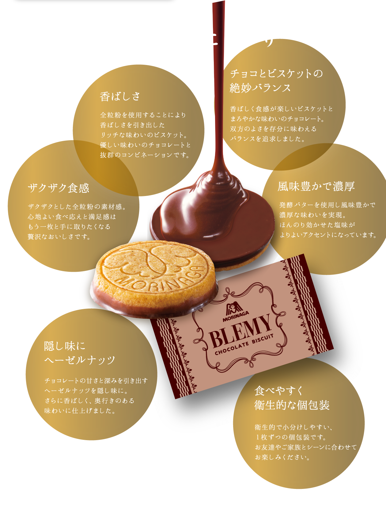 BLEMYのこだわり 香ばしさ 全粒粉を使用することにより香ばしさを引き出したリッチな味わいのビスケット。優しい味わいのチョコレートと抜群のコンビネーションです。チョコとビスケットの絶妙バランス 香ばしく食感が楽しいビスケットとまろやかな味わいのチョコレート。双方のよさを存分に味わえるバランスを追求しました。ザクザク食感 ザクザクとした全粒粉の素材感。心地よい食べ応えと満足感はもう一枚と手に取りたくなる贅沢なおいしさです。風味豊かで濃厚 発酵バターを使用し風味豊かで濃厚な味わいを実現。ほんのり効かせた塩味がよりよいアクセントになっています。隠し味にヘーゼルナッツ チョコレートの甘さと深みを引き出すヘーゼルナッツを隠し味に。さらに香ばしく、奥行きのある味わいに仕上げました。食べやすく衛生的な個包装 衛生的で小分けしやすい、1枚ずつの個包装です。お友達やご家族とシーンに合わせてお楽しみください。BLEMYのこだわり 香ばしさ 全粒粉を使用することにより香ばしさを引き出したリッチな味わいのビスケット。優しい味わいのチョコレートと抜群のコンビネーションです。チョコとビスケットの絶妙バランス 香ばしく食感が楽しいビスケットとまろやかな味わいのチョコレート。双方のよさを存分に味わえるバランスを追求しました。ザクザク食感 ザクザクとした全粒粉の素材感。心地よい食べ応えと満足感はもう一枚と手に取りたくなる贅沢なおいしさです。風味豊かで濃厚 発酵バターを使用し風味豊かで濃厚な味わいを実現。ほんのり効かせた塩味がよりよいアクセントになっています。隠し味にヘーゼルナッツ チョコレートの甘さと深みを引き出すヘーゼルナッツを隠し味に。さらに香ばしく、奥行きのある味わいに仕上げました。食べやすく衛生的な個包装 衛生的で小分けしやすい、1枚ずつの個包装です。お友達やご家族とシーンに合わせてお楽しみください。