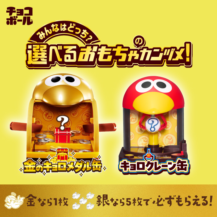 今ならおもちゃのカンヅメが選べる!メダルゲームができる「金のキョロメダル缶」と、クレーンゲームができる「キョロクレーン缶」からどちらかお選びいただくことができます。どちらもヒミツのおもちゃ入り!なにが出てくるかわからないワクワク感をぜひお楽しみください!
