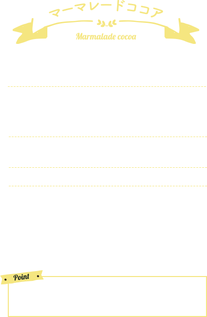 「牛乳で飲むココア」12gと牛乳150ml。150mlで、カルシウム、鉄、ビタミンDが補給できます。大好きなココアだから、ゴクゴクのんでしまう。