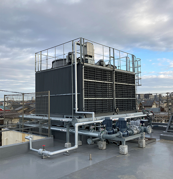 A newly installed cooling tower for refrigeration equipment at Morinaga Angel Dessert Co., Ltd.