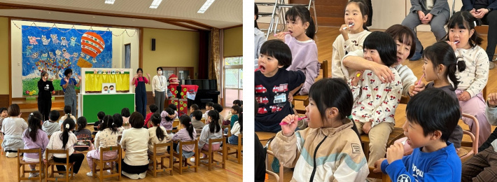 11月6日(木)に口腔ケア指導に関する研修を受けた、とよた保育園の保育者と中野市の歯科衛生士が、11月7日(金)にオリジナル口腔ケア教材(マグネットシアター)を用いた指導を行い、園児たちは楽しみながら口腔ケアの重要性とその方法を学びました。