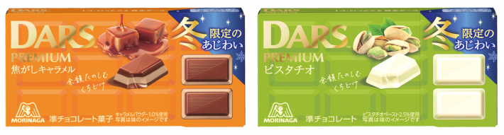 「ダースプレミアム<焦がしキャラメル>」は、焦がしキャラメルとコク深いミルクチョコレートが相性抜群の3層仕立ての「ダース」です。「ダースプレミアム<ピスタチオ>」は、とろけるようなピスタチオの余韻を感じるチョコレートを、クリーミーなホワイトチョコレートで挟みました。