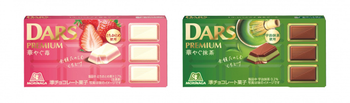 「ダースプレミアム<華やぐ苺>」は、コクのあるホワイトチョコレートで、ほどよい酸味が特長で香りがよい“とちおとめ”の果汁を使用した苺のチョコレートを挟んだ3層仕立てのプレミアムなダースです。「ダースプレミアム<華やぐ抹茶>」は、やさしいミルクのコクを楽しめるチョコレートで、繊細で上品な甘みと旨味の“宇治抹茶”を使用した抹茶のチョコレートを挟みました。
