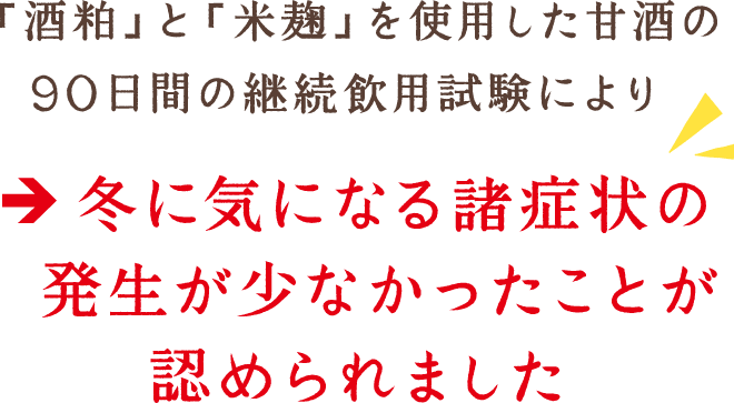 酒粕と米麹の両方を原料とした甘酒の継続飲用は、気になる諸症状の発生日数を抑制することが示唆されました。