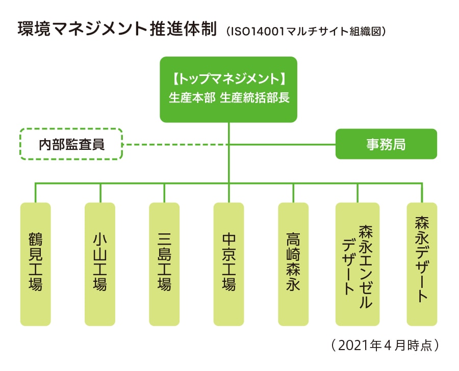 森永製菓グループは、代表取締役社長を委員長とするサステナビリティ委員会において、環境に関する重要方針および目標の審議・策定、進捗状況のレビューなどを行っています。また、生産統括部とサステナブル経営推進部のメンバーによる環境統合事務局を設置し、工場環境管理委員会などと情報交換を図り、環境マネジメントシステムの継続的改善と環境負荷低減、生産性向上への取り組みを推進しています。