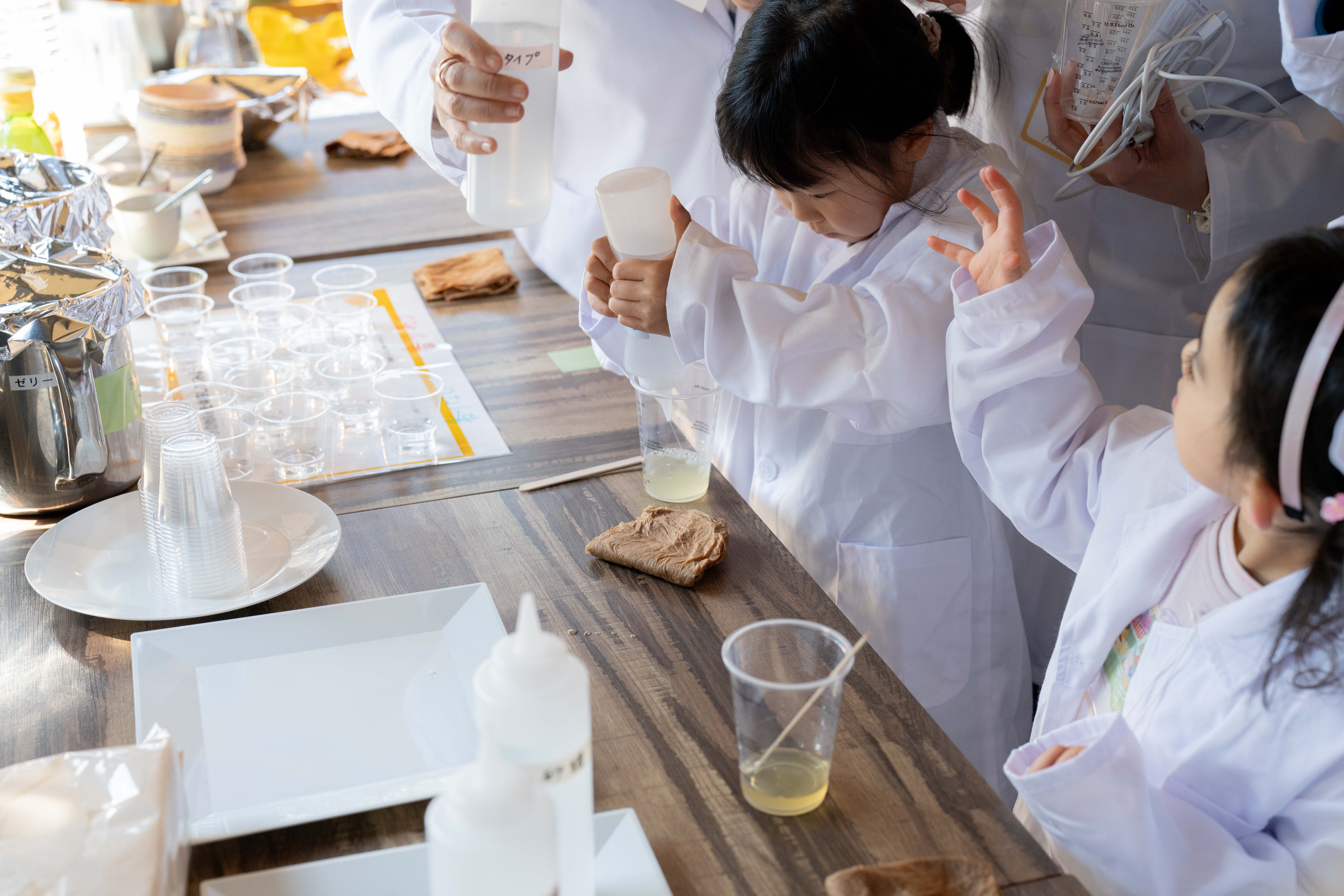 2014年から公民連携で横浜市立横浜サイエンスフロンティア高等学校・付属中学校へ「サイエンス交流事業」を実施しており、2025年で11年目の取り組みとなりました。鶴見区内の小学生を対象に、チョコレートに生クリームを加えて生チョコを作る体験を通して、水と油の乳化現象を学ぶプログラムです。森永製菓研究員監修のもと、サイエンスフロンティアの中・高校生が講師となって座学と実験を指導しました。