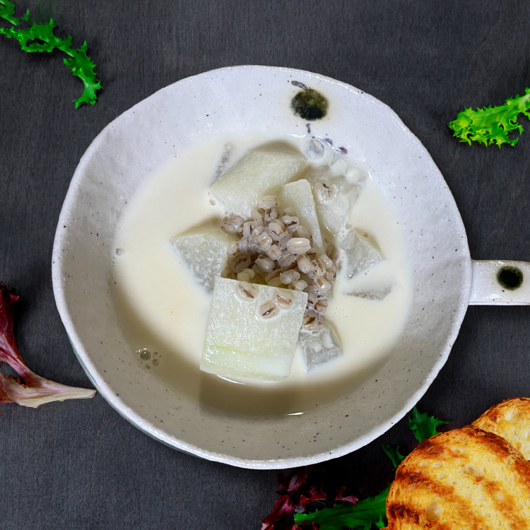 冬瓜ともち麦の豆乳スープレシピ 調理時間の目安:30分 【材料|2人分】 冬瓜 300g もち麦 大さじ2 豆乳 約240ml(2本) 白だし 大さじ2 【作り方】 ① 冬瓜は皮と種を取り除いて、約1.5cmのサイコロ状に切る。 ② もち麦を沸騰したたっぷりのお湯で下茹でする(15分)。10分経過したらサイコロ状に切った冬瓜を加え、残り5分、一緒に下茹でする。 ③ もち麦と冬瓜をザルにあげ、水気を切る。 ④ 鍋に豆乳(約240ml)と白だし大さじ2を加え、もち麦と冬瓜も入れる。中火でゆっくり温め、沸騰直前で火を止める。豆乳は分離しやすいので煮立たせないよう注意しましょう。 ⑤ 器に盛り付けて完成!お好みで黒こしょうや青ねぎをトッピングしても美味しいです。 【ポイント】 とても簡単で、やさしい味わい。豆乳のまろやかさと冬瓜の食感が楽しめます。 腸活にもおすすめのもち麦入り、お腹も心も温まるスープひと椀です。 朝食や夜食、小腹が空いた時にもぴったり! やさしい味わいをぜひお楽しみください。 作成者:森永ダイレクトストア スタッフK