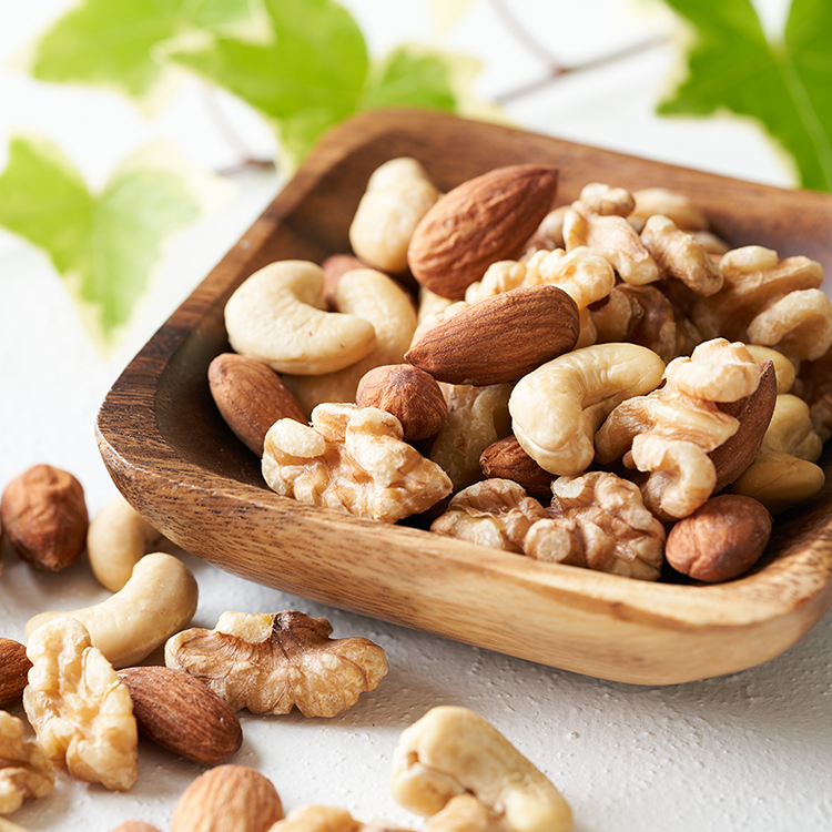 食事の1~2時間前に適量のナッツを食べよう! ナッツは、カロリーが高いイメージがあるかもしれませんが、実はダイエット中にも嬉しいポイントがたくさんあります。主な理由を3つご紹介します。 ●︎満腹感が持続し、食べ過ぎ防止に ナッツは噛みごたえがあり、よく噛むことで満腹中枢が刺激されるため、少しの量でも満足感が得られます。 さらに、ナッツには脂質や食物繊維が豊富なため満腹感が持続します。おやつをナッツにするだけで、食べ過ぎ防止になります。 ●美と健康をサポートする栄養がたくさん ナッツにはオレイン酸やリノール酸、α-リノレン酸といった、「不飽和脂肪酸」が豊富に含まれています。不飽和脂肪酸は、脂質のため食べ過ぎには注意が必要ですが、肥満のリスク軽減や、生活習慣病の予防する効果が期待されています*1。 また、ナッツは「不溶性食物繊維」も多く含んでおり、お腹の調子を整えて、便秘や下痢等のお腹のトラブル改善にも役立ちます。 ●︎血糖値の急上昇を防ぐ 食後に血糖値が上がると、インスリンというホルモンが分泌されます。インスリンには血糖値を下げる役割がありますが、その一方で、血糖値が急上昇した場合には、余分な糖を脂肪として溜め込む働きもあります。 ナッツに含まれる不飽和脂肪酸や不溶性食物繊維には、この血糖値の上昇をゆるやかにする効果が期待されています。 食事の1~2時間前に適量のナッツを食べることで、血糖値の急上昇を抑え、満腹感から、食べ過ぎ防止にもつながります。