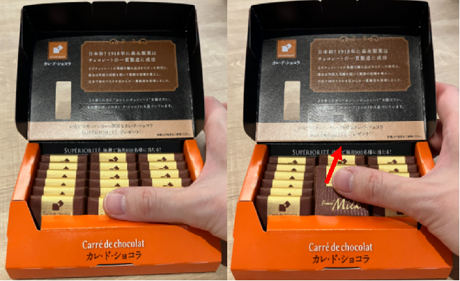 「カレ・ド・ショコラ」のお菓子が取り出しづらい場合は、手前のチョコレートを指で上に押し上げるようにすると簡単に1枚ずつ取り出すことができます。