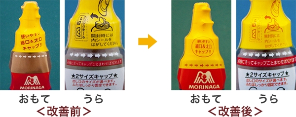 細口と太口キャップがあることが分かりづらかったので、ケーキシロップ上部の「使いやすい細口&太口キャップ!!」という 文言について、文字の太さと文字の色を変更して見やすくしました。 また、「点線にそってキャップごとまわせば切れます」という文字も大きくして、開け方をわかりやすくしました。
