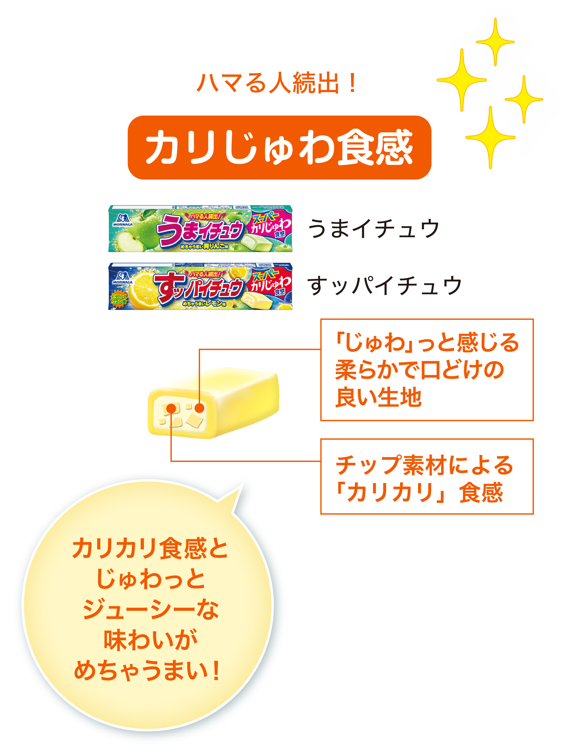 ひとつぶで、みんな嬉しい笑顔になるハイチュウの「食感」のひみつを大公開。それぞれの食感の研究者たちがご説明いたします。