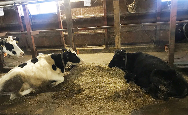 中では牛たちがのんびりとくつろいでます。積雪期は牛舎で生活しているそうです。