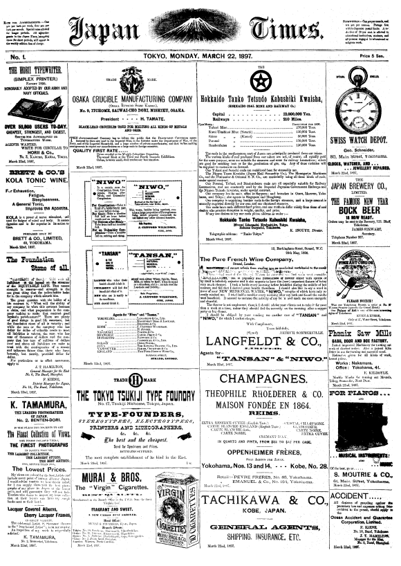 世の中はまだ函館、横浜、神戸に治外法権の外国人居留地が残っているころで、海外と対等に付き合い、正しい日本の姿を他国にアピールする必要が国内でかまびすしく叫ばれていました。その声に応えるように、日刊の英字新聞、The Japan Timesは誕生したのです。