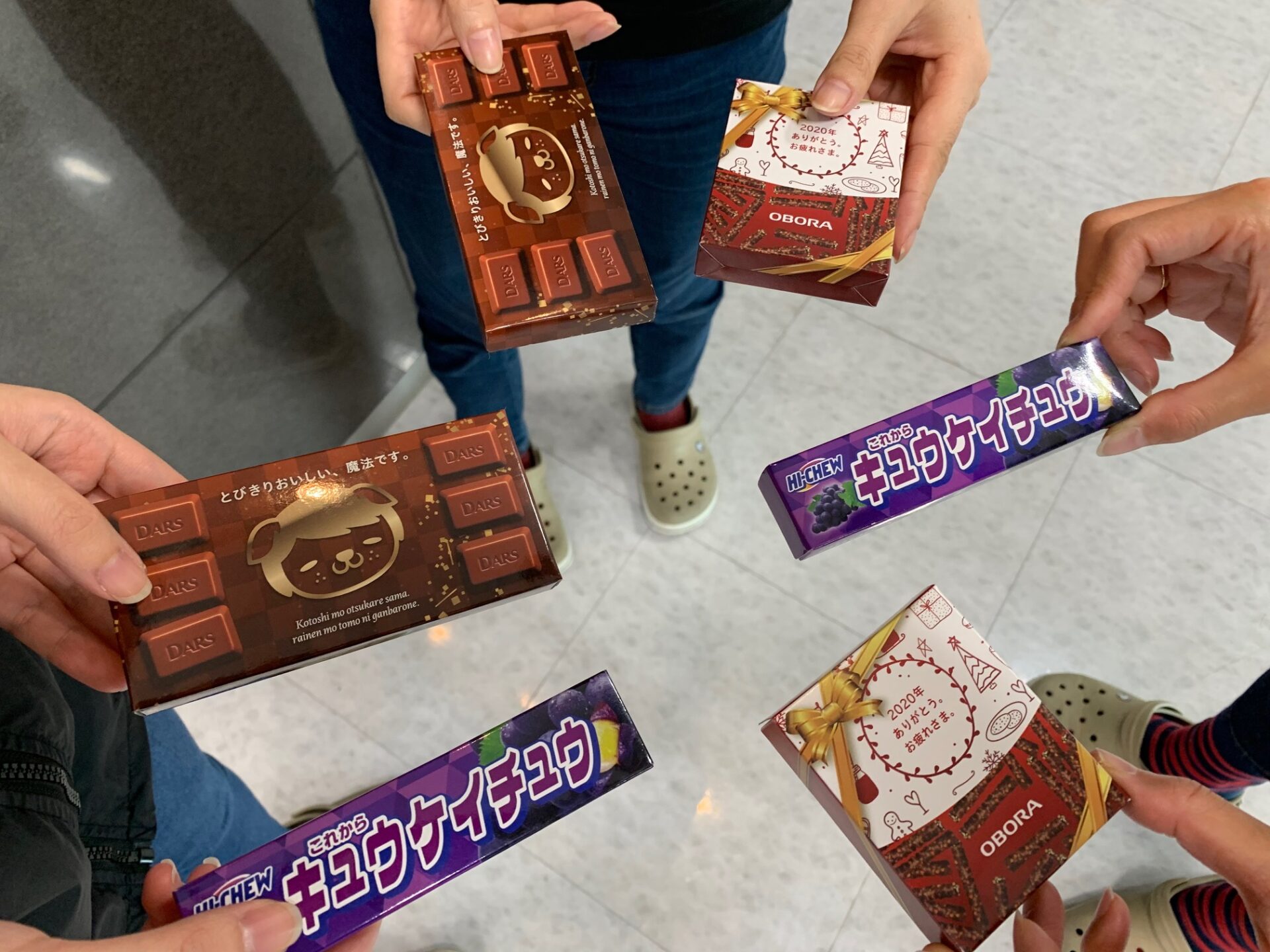そんな大洞印刷様には、忘年会や新年会の代わりとして、おかしプリントのハイチュウ・小枝・ダースを採用して頂きました。
