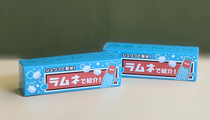 おかしプリントでは、ラムネの入ったボトルを収納する箱をデザインできます。