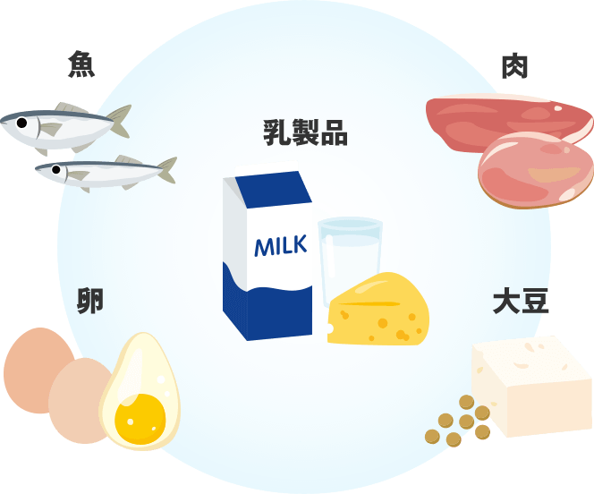 食品でいうと肉、魚、大豆製品、卵、乳製品などに含まれており普段の食事から摂取できる栄養素です。
