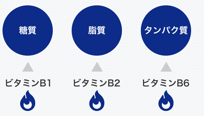 ビタミンは、「タンパク質」や「炭水化物」、「脂質」のようにカラダの材料やエネルギー源にはなりませんが、これらの栄養素をスムーズに代謝する働きがあります。