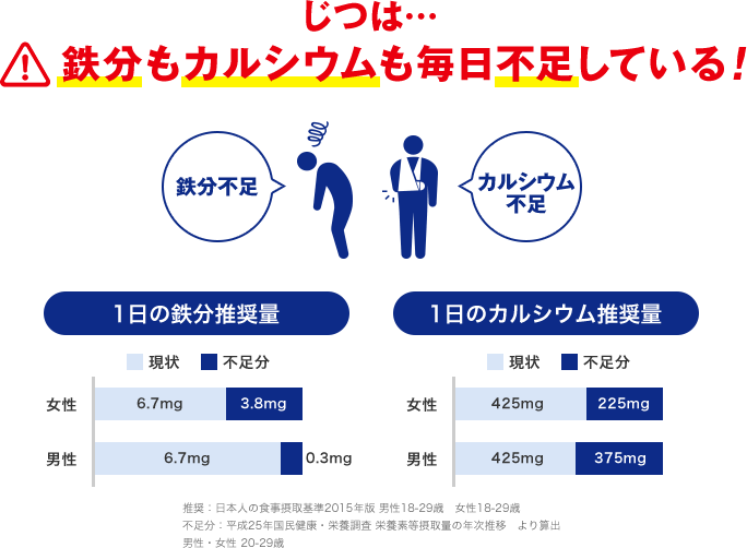 ミネラルは体内で合成できない為、食事での摂取が重要となりますが、カルシウムや鉄分などは普段の食事で摂り切れていない事が現状です。
