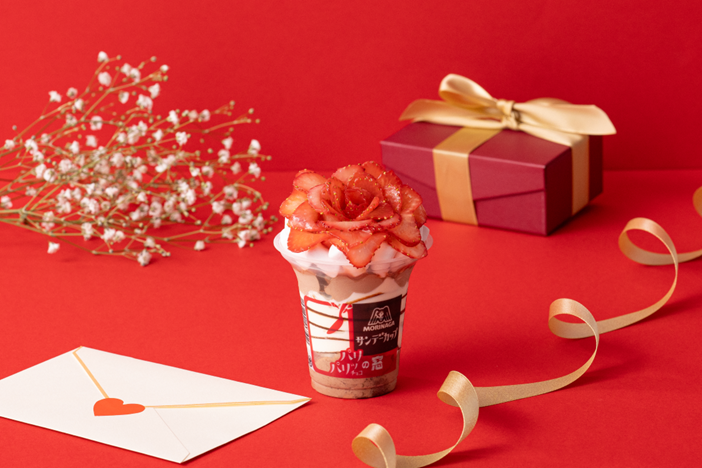 サンデーカップにマシュマロを盛りつける。いちごを薄くスライスし、ずらして重ねくるくると巻き、カップの中央に飾り、花びらを広げでできあがり。
