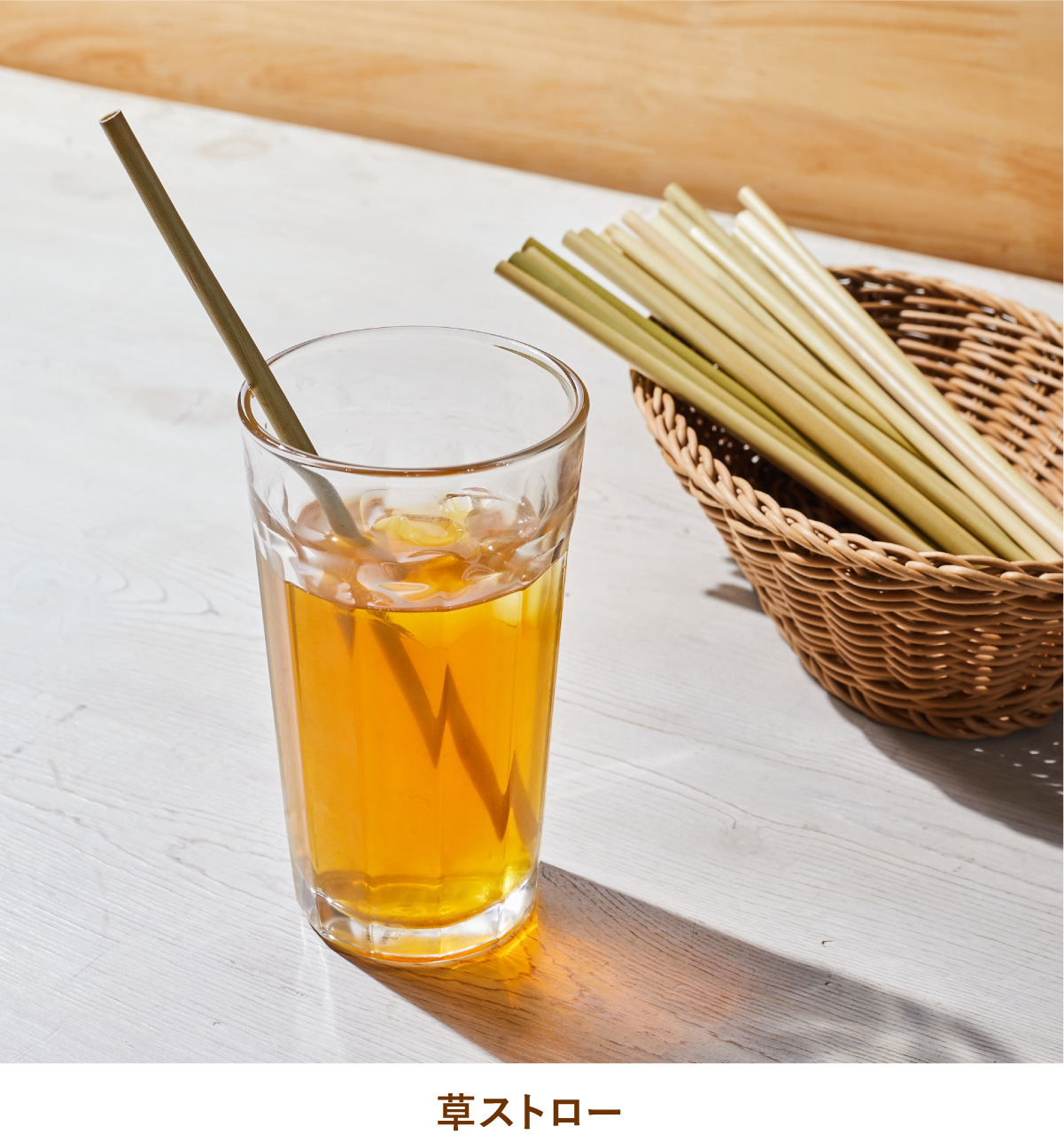 そこで、プラスチックストローのかわりに、海にもやさしい草ストローを使う選択肢を設けたいと思ったのです。草ストローは水分をすうと強くなり、使い心地もよくなります。ふやけやすい紙ストローとの大きな違いです。また、くすりを使わず、清潔な場所で作っているので、安心して使えます。